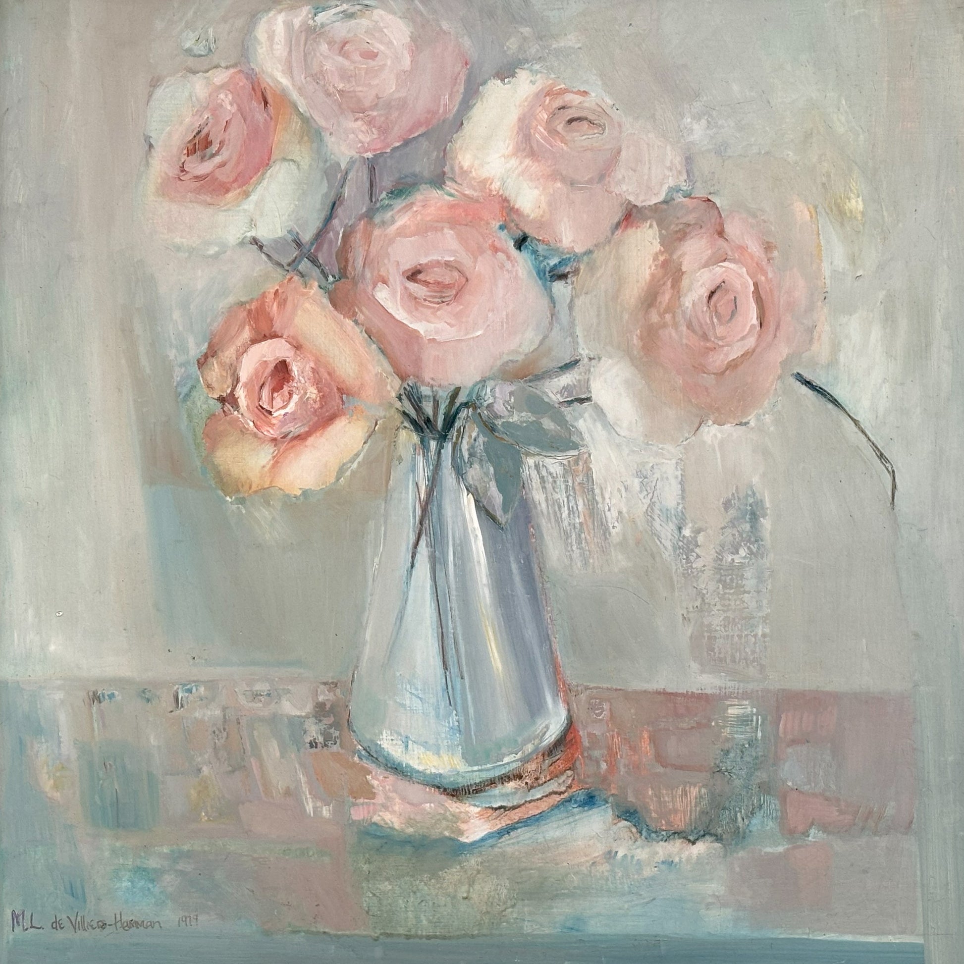 Lovely still life of roses in muted blush tones signed M.L De Villiers Hamman.