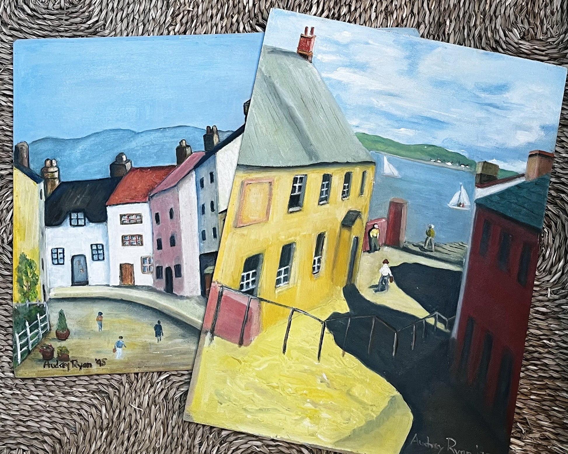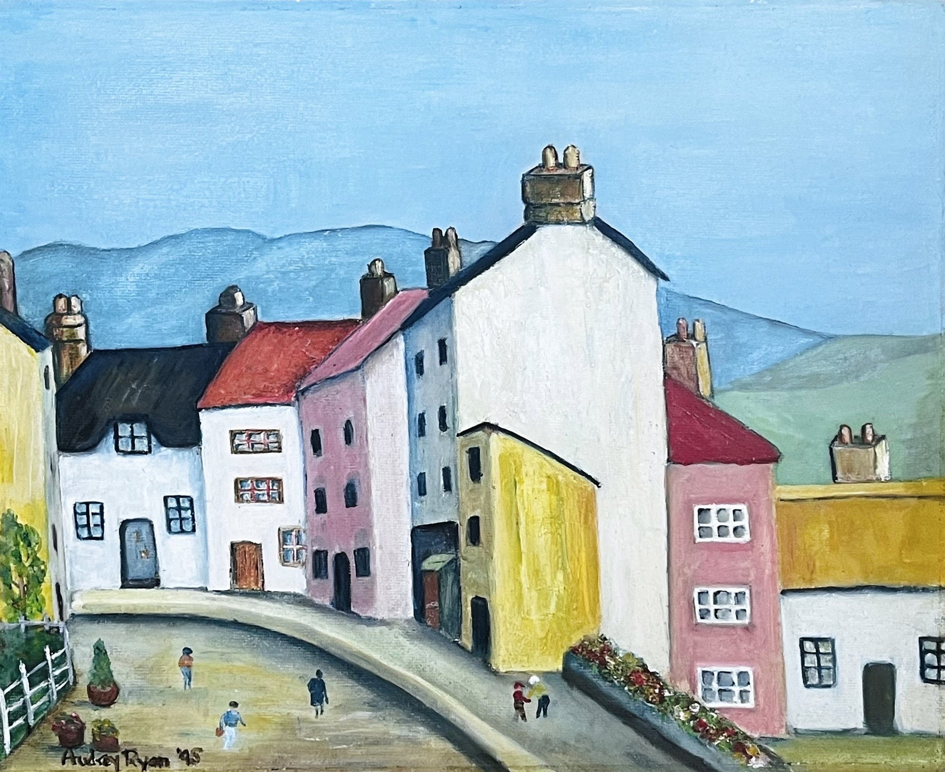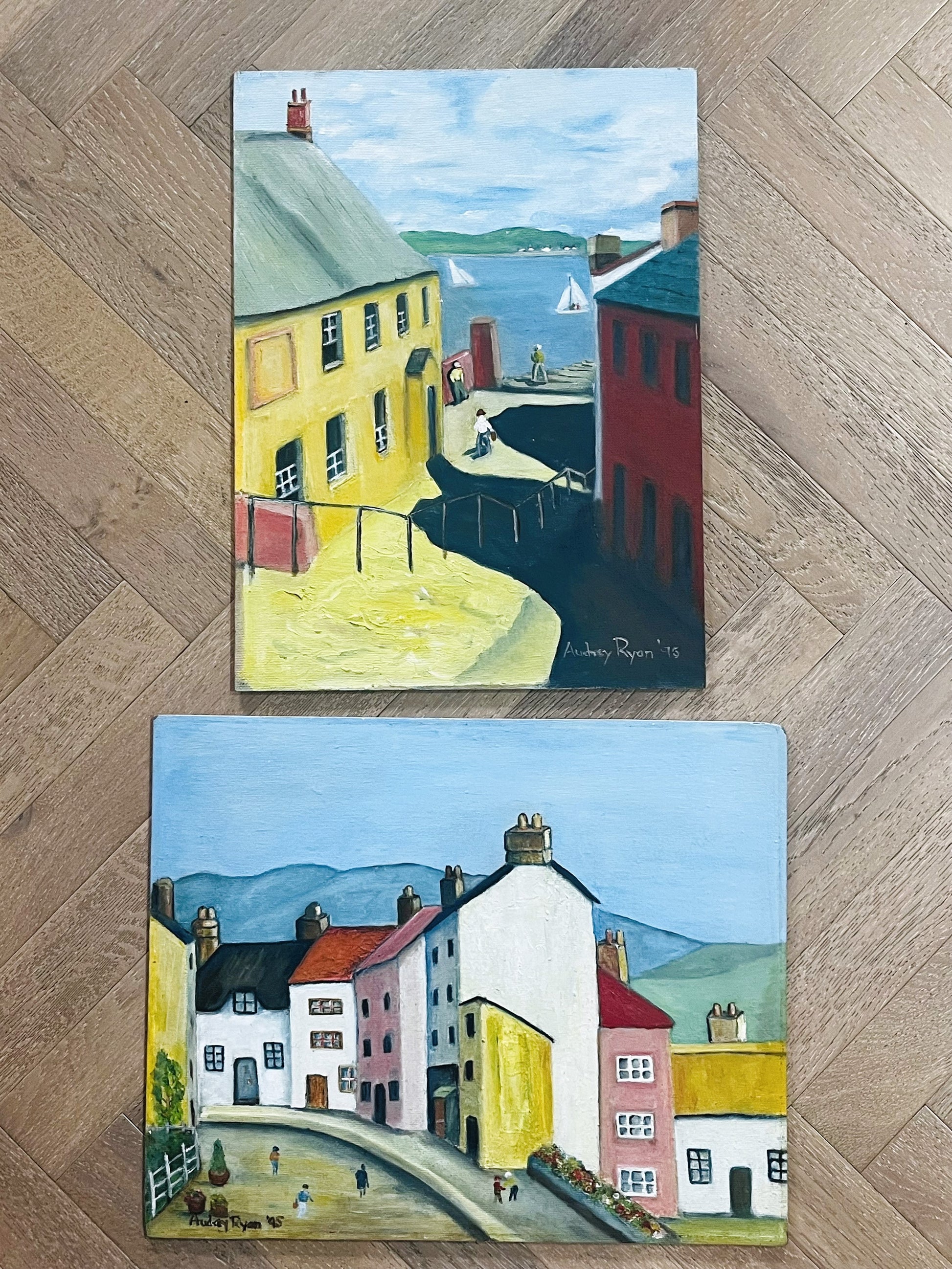 Lovely pair of folk art paintings depicting lively town scenes signed A. Ryan.