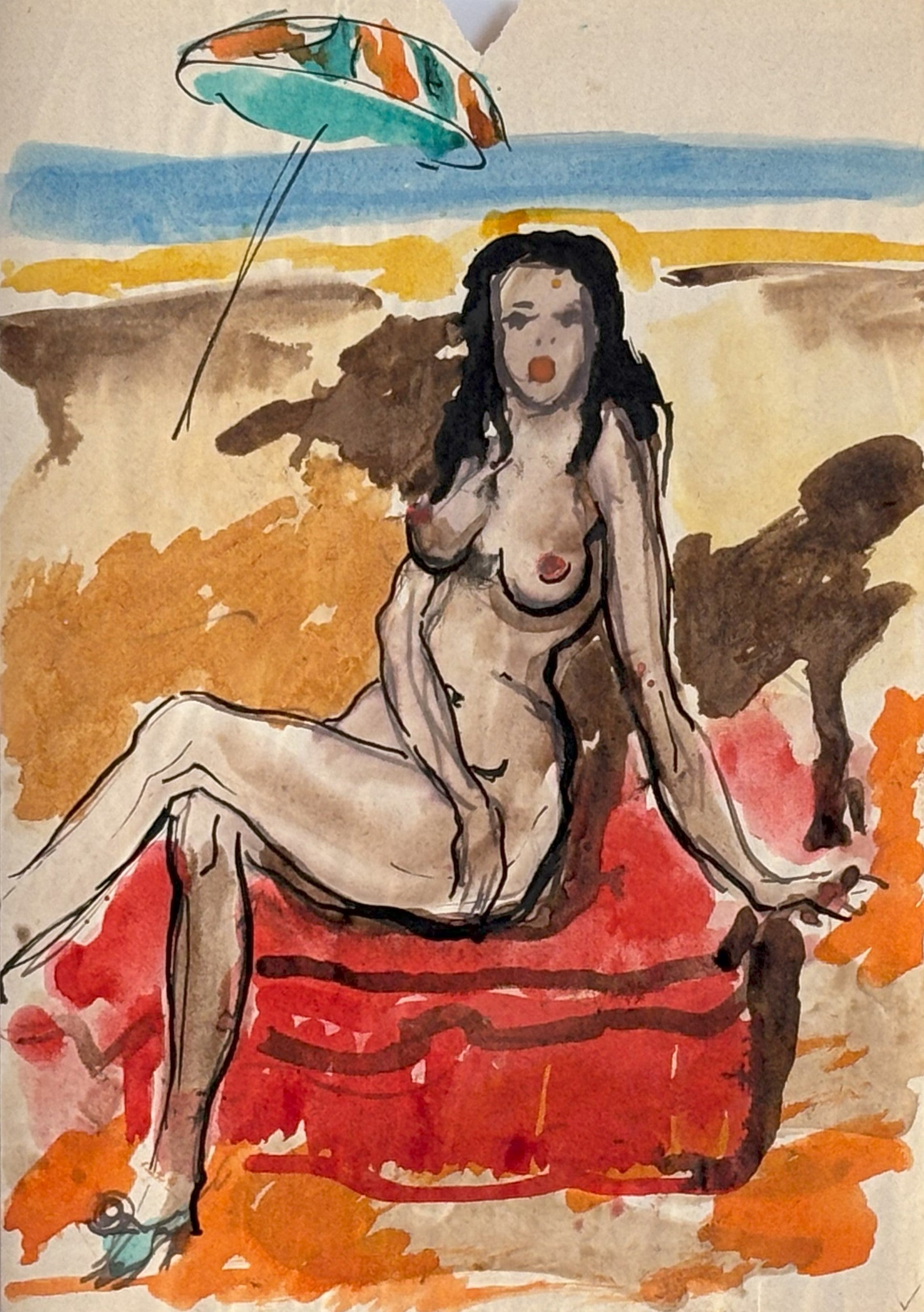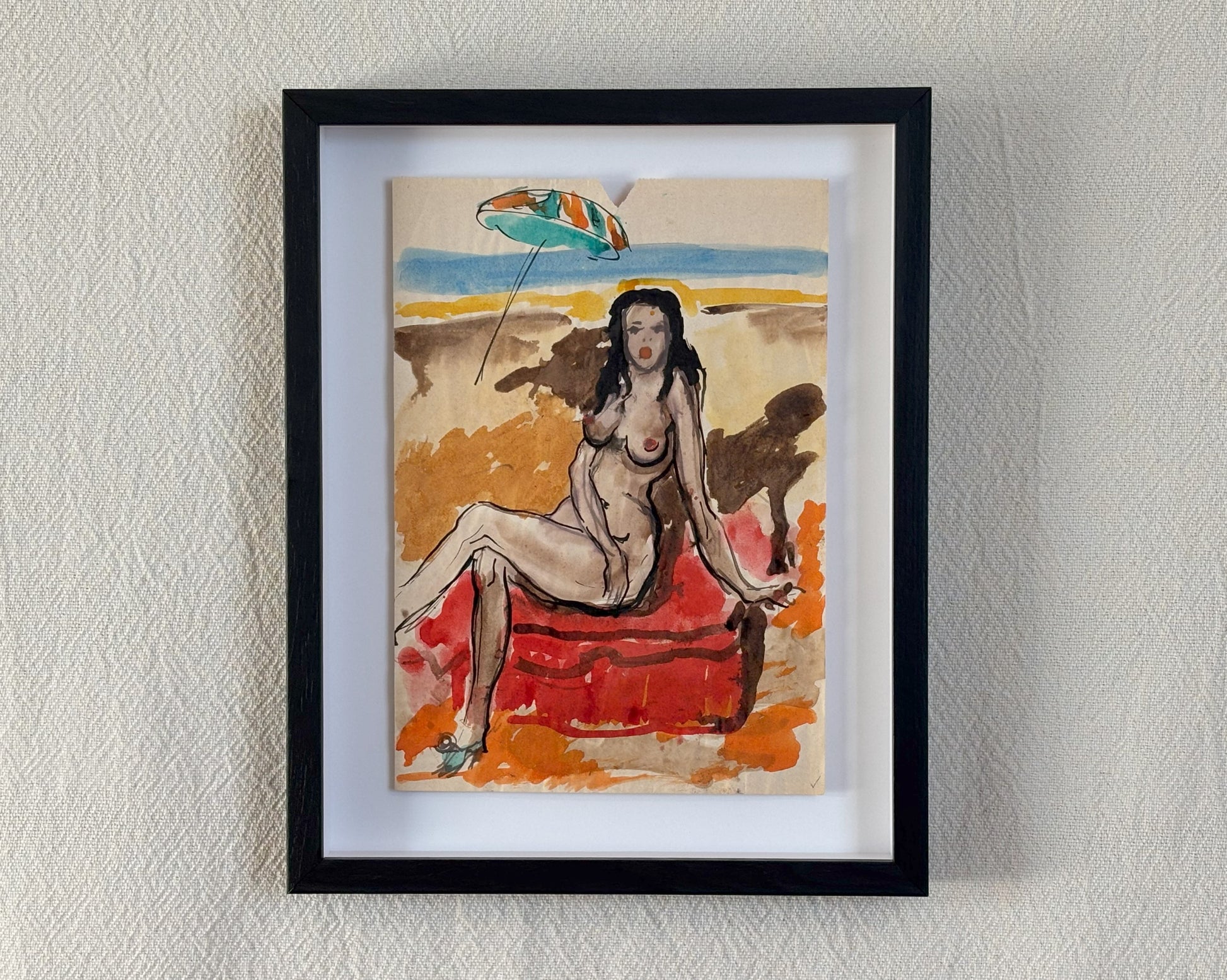 Spectacular original vintage artwork of seated nude on paper.
